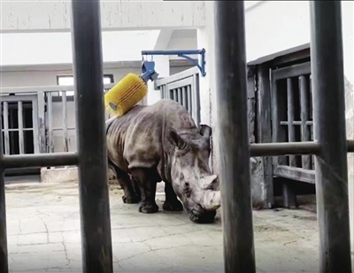 该中心的马斌、雷钧告诉记者,牛体刷刚安好的时候,两个大家伙十分畏惧,不时地用角试探性地顶几下,一见刷子摇晃起来吓得掉头就跑。更搞笑的是,牛体刷不远处就是两头白犀们“厕所”,刚开始的几天,因为害怕这个凭空出现的大刷子,它们甚至改变了方便的地方。