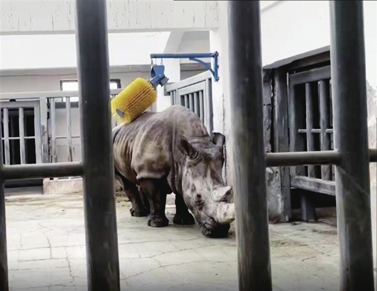为解决这一动物的生活问题,提升白犀的幸福指数,太原动物园野生动物研究中心的工作人员开始发动“头脑风暴”。起初设想的是,在馆舍内架设一根圆木,专门供白犀蹭痒,但在实际操作中发现,木头如果太细,容易被犀牛顶起来,发生安全事故;如果太粗,又很难搬运、架设、固定。之后,他们借鉴了北京动物园和南京红山森林动物园的成功案例,决定引进牛体刷。记者在现场看到,这种刷子有着像意大利面一样粗的硬刷毛,园中的两头白犀靠近后无意中一碰,牛体刷就会被抬高,而这种刷子任意角度抬高15°就会自动运行,继而像自动洗车一样,固定或者打转给白犀挠痒痒。从白犀惬意的表情就可感觉到,牛体刷位置恰当、力道给力,白犀实现了挠痒痒自由!