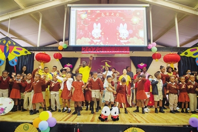 2月3日,在博茨瓦纳首都哈博罗内,博茨瓦纳大学孔子学院在教学点丽海国际小学举办“我爱中国年”迎新春活动。这是老师和学生一起表演节目。