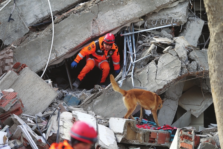 2月7日,救援人员在土耳其南部卡赫拉曼马拉什市地震废墟中搜寻幸存者。新华社 发