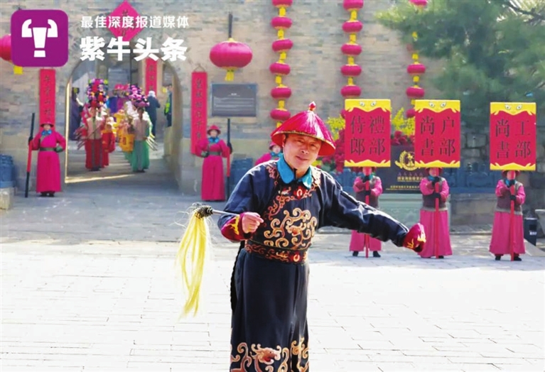 景区每天上午都会举行大型开城仪式《迎圣驾》的表演,很多游客都对其中的“小太监”一角印象深刻。他身着蟒袍,头戴官帽,手持拂尘,左摇右晃地迈着碎八字步出现在广场中央,然后连喊两遍:“皇上驾到,大学士陈廷敬接驾!”那“高八度”的吆喝声,像模像样,让游客们饶有兴趣,津津乐道。