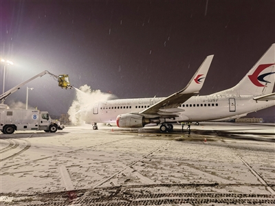 一场降雪如约而至,太原机场也忙碌起来。2月9日凌晨4时,在停机坪上,一辆除冰车缓缓靠近一架飞机,除冰员手持高速喷枪向飞机的机翼和尾翼喷洒除冰液,相当于给飞机洗“热水澡”。据悉,这是东航山西分公司对出港航班进行预除雪作业,在航班起飞前还会进行第二次除霜除雪作业,全力保障旅客出行安全。 李涛 倪芳 摄
