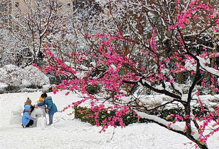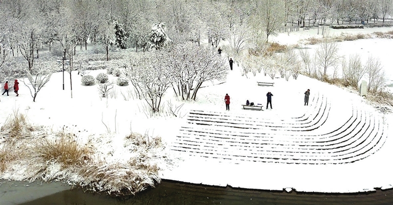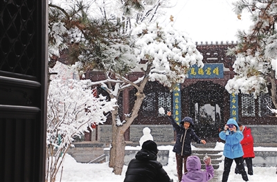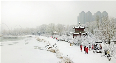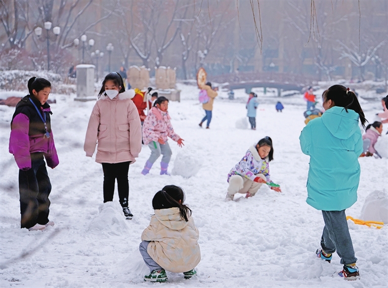 不远处,一个小男孩正聚精会神地和小伙伴堆着一条“雪龙”。尽管男孩的小脸蛋、小手被冻得通红,但他玩雪的兴致不减。一旁的母亲笑着说:“早上起床就吵着要出去玩雪。已经玩了两个多小时,还不肯走,玩不够。”