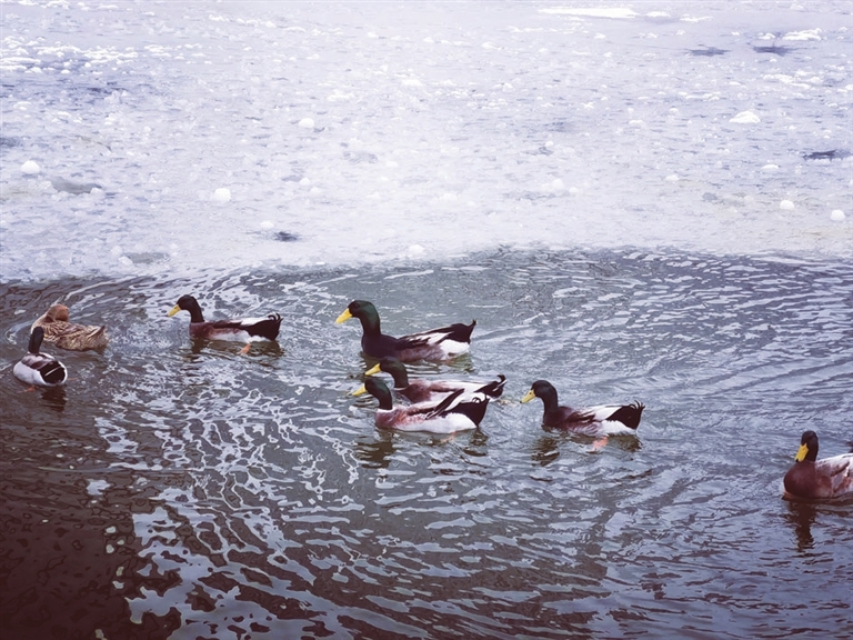 “春江水暖鸭先知”。2月13日,龙潭公园里部分冰面已经融化,一群鸭子在水中嬉戏。 李晓琳 摄