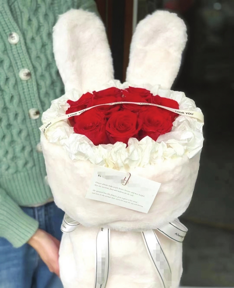 用绒布包裹花束,还插上两只“兔耳朵”,是今年火出圈的“小兔子乖乖”礼品花,其外形赏心悦目,捧在手里感觉软软的、暖暖的,让人爱不释手,浓浓爱意扑面而来。“预订很火,虽然价格比普通花束贵几十元,但年轻人特喜欢。”某网上花店店主薛女士说,这种可爱兔造型的花束从去年底就慢慢火起来,消费人群以“00后”为主,他们个性张扬、追求时尚,对新鲜事物接受能力强,此类创意商品一上市即刻就受到追捧。