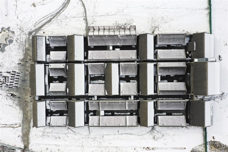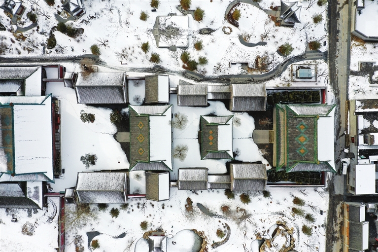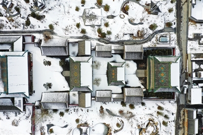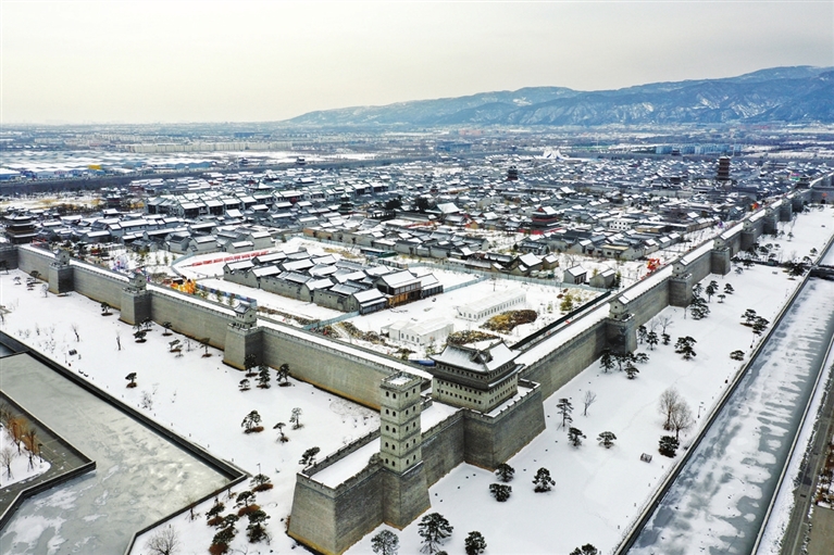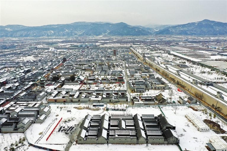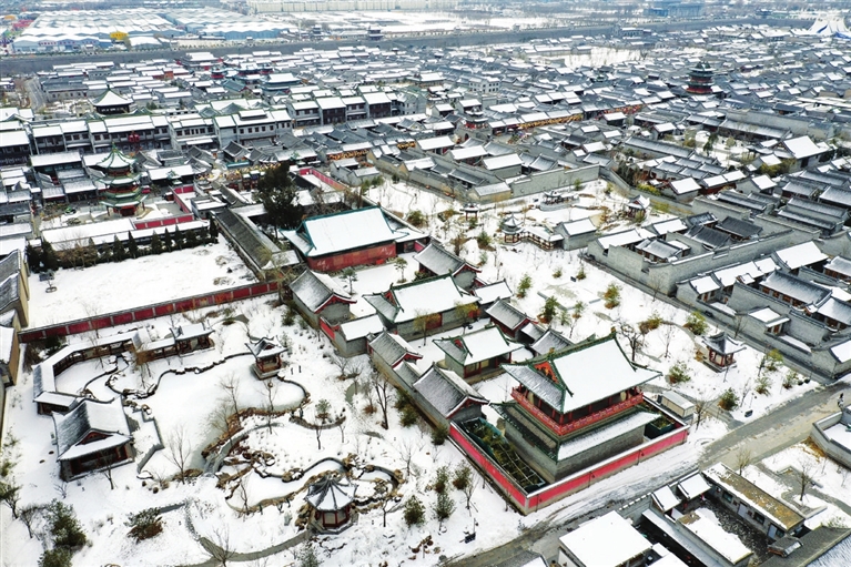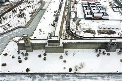 一场降雪过后,位于山西省太原市晋源区的太原古县城银装素裹,美景如画。