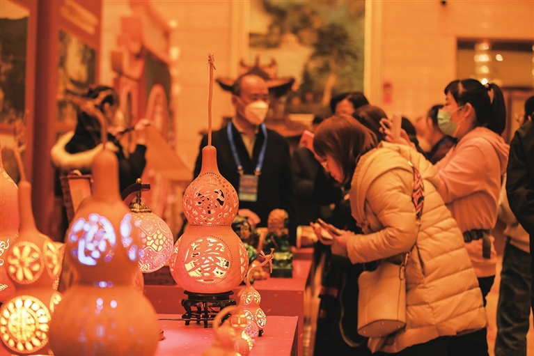 会场外,与会嘉宾兴致勃勃地参观着太原传统剪纸、琉璃烧制技艺、葫芦镂空雕刻、太原面塑、金丝珐琅画技艺、山西民居砖雕、传统面食制作技艺、老陈醋酿制技艺等展台上的展品。在山西民居砖雕展台前,山西百盛商业发展有限公司山西区域总经理陈昱茹详细了解了砖雕的市场运用情况。她感慨地说:“山西本身就是一个‘博物馆’,未来发展可期。未来的商业是向消费者输出生活方式,商业要与文化深度融合,相互赋能,如果能与非物质文化遗产开展合作,一定很有魅力。这种新的商业模式会给太原人民带来不一样的生活体验。”