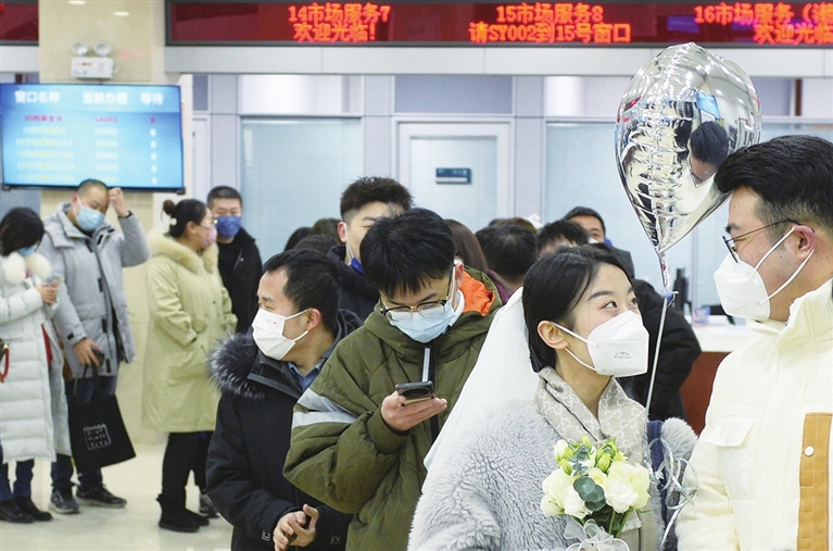 2月14日,我市各婚姻登记处迎来节后首个结婚登记小高峰。图为迎泽区政务服务中心内,前来办理结婚登记的市民排起长队。牛利敏 摄