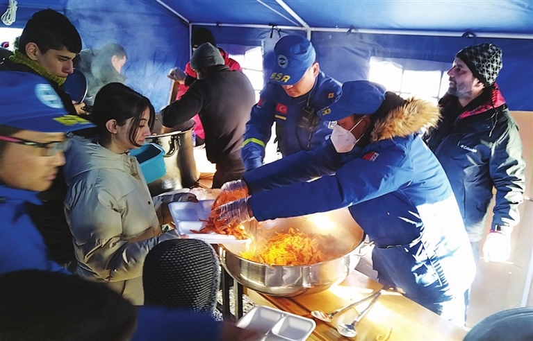 2月13日,中国蓝天救援队在土耳其马拉蒂亚向当地受灾民众分发食物。