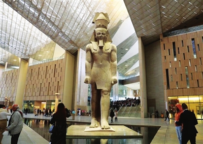 博物馆第二个重要看点便是被安放于入口主厅内、高达12米多的拉美西斯二世雕像。这件重达83吨的埃及国宝级文物,也是大埃及博物馆内最大的文物。