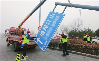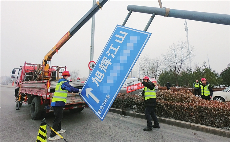 2月18日,太原市城乡管理局开展市政设施大排查、大整治行动,通过多部门联动协作机制,对擅自设立的仿交通指示广告牌匾集中拆除,消除安全隐患,净化城市公共空间。 宋卫东 张启亮 摄