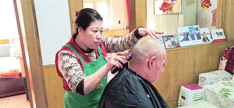 当天,面积不到10平方米的小店顾客坐得满满当当。为客人修剪鬓角碎发前,店主老张会在一块剃刀布上“唰唰”地把剃刀磨得锃亮。“从早上8点半开门到现在,就没闲下来过呢!”老张的老伴一边忙着给顾客洗头一边唠嗑,“我们的客人一般都是熟客,来店里的基本是剃头、理发,跟美发是两回事儿。”