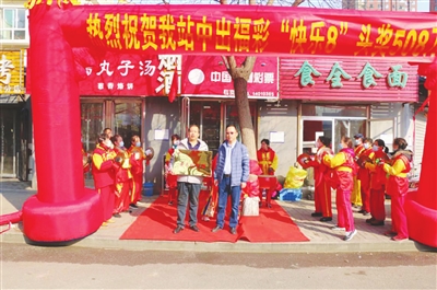 大奖中出后,太原市福彩中心在第一时间启动大奖宣传预案,精心组织,积极开展系列宣传活动。市福彩中心工作人员及时联系站点业主,指导业主悬挂中奖横幅,张贴中奖喜报,联系锣鼓队进行庆祝。中心工作人员为站点业主颁发幸运投注站牌匾,同时,市福彩中心在全市福彩投注机及站点LED屏幕上及时发布中奖信息;通过微信公众号等宣传平台发布中奖信息,让广大市民知晓。太原市福彩中心通过多渠道、全方位的宣传方式进一步扩大快乐8游戏在太原市的品牌影响力,为福彩销售营造了良好的氛围。