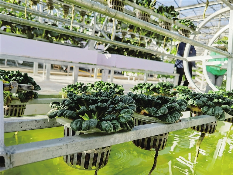 乌塌菜、紫生菜、苦苣、紫油麦菜、紫白菜、大叶茼蒿、奶油菜心、紫芹菜、大叶香菜……智能温室中蔬菜品种不少,却都长在水培槽中,见不到土壤的影子。