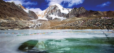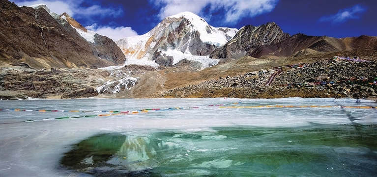 西藏拉萨市尼木县境内的琼穆岗嘎峰海拔7048米,是念青唐古拉山脉南端最后一座高峰。琼穆岗嘎冰川气势恢宏,冰臼湖群点缀其间,湖水结冰后呈现出梦幻般的色彩,恍若仙境。