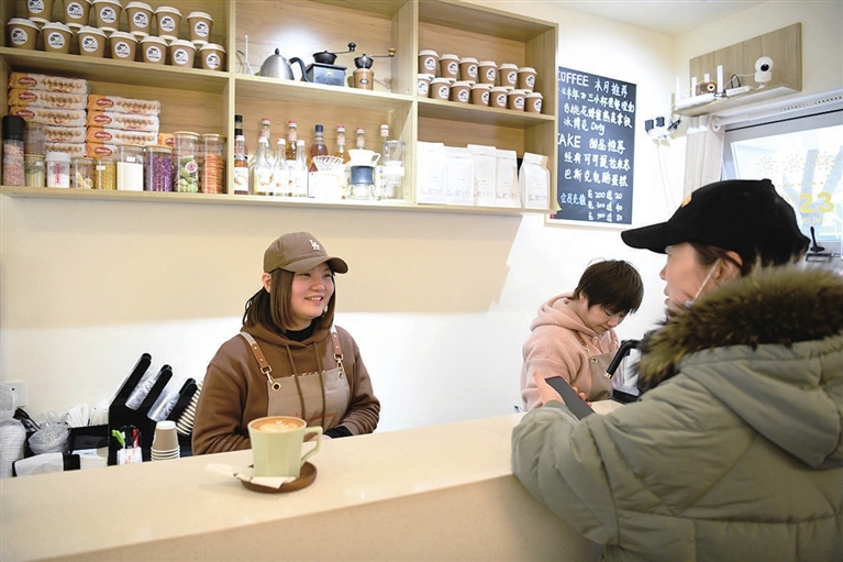 2月16日,杨倩(左)在咖啡店里与客人交流。