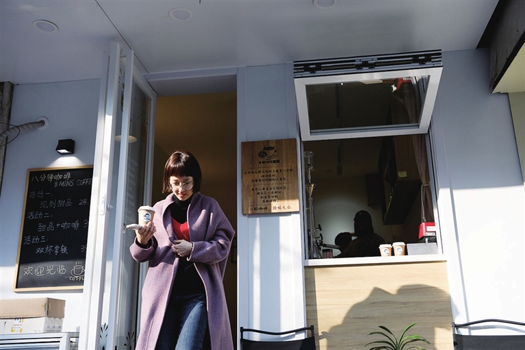 客人在杨倩的咖啡店里购买咖啡后离开。