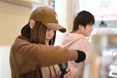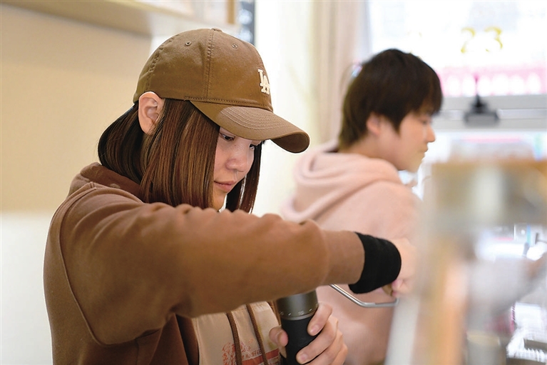 2月16日,杨倩(左)在咖啡店里制作咖啡。