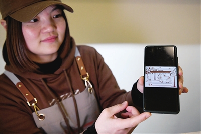 2月16日,杨倩展示客人在“8分钟”咖啡店门前创作的绘画。