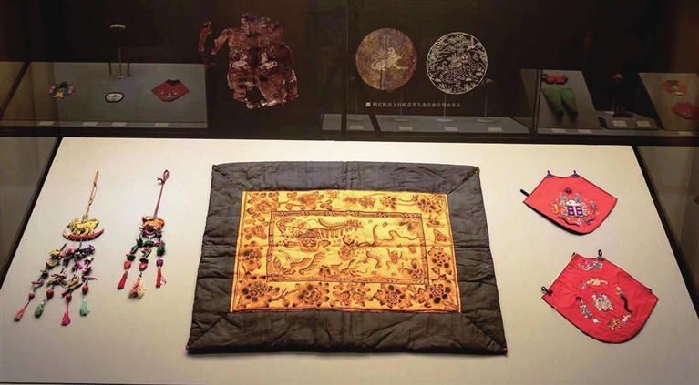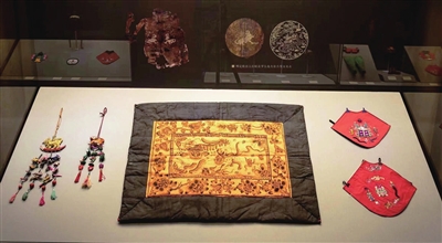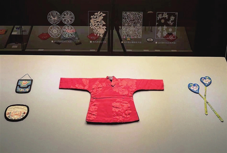 “绣罗童裳——馆藏近代童衣装饰纹样展”,以近代儿童服饰为展示对象,绣花小帽、小肚兜、荷包、护牌等,无论是色彩、造型,还是工艺、纹样,都渗透着中国民间传统艺术的魅力。鞋、帽等服饰上精美的刺绣纹样,也得以窥见中国式浪漫。