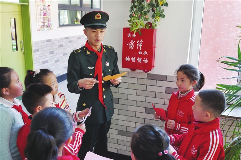 热情激扬的童声宣誓响彻校园,雷锋年轻而又挺拔的塑像前,同学们庄重留影,许下青春誓言。