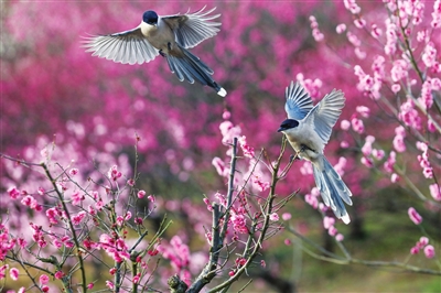 2月21日,灰喜鹊在江苏扬州瘦西湖“湖上梅林”中翩飞起舞。