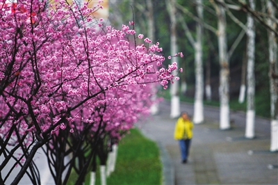 2月20日,市民在重庆市九龙坡区南北大道旁的人行道赏花。