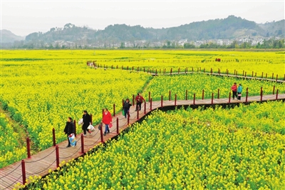 2月20日,游客在贵州省平塘县平舟镇京舟村油菜花田游玩。