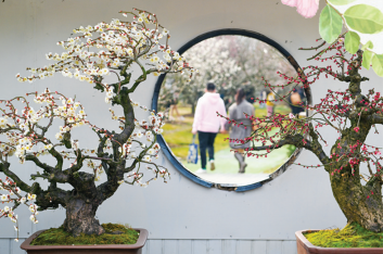 2月18日,游客在江苏省第二十七届苏州太湖梅花节香雪海梅花盆景展上欣赏梅花。