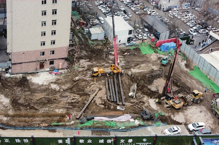 2月23日,位于解放南路的山西医科大学第一医院综合楼项目工地,太原一建集团施工人员正在进行地基打桩作业。项目建成后,将缓解患者看病难问题。 张昊宇 王政 摄