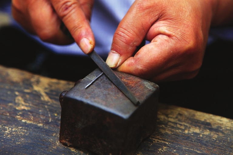 “大阳手工制针程序,环环相扣。一个环节差之分毫,则整根针全部报废。”不是亲眼所见,真想不到一枚小小的钢针,在裴师傅手里,要经过上百件工具精益求精地打磨,才能由5毫米宽的熟铁条,变成了一枚枚直径0.3毫米的钢针。裴师傅总结了一下,大阳钢针从加工原料到制成成品总共有72道工序,除去冶炼的一部分,单纯制针,就有取火、凿条、滚圆、捶扁、冲孔、锉尖、热淬、冷淬、掩蒸、抛光等二十多道工序,祖辈们就是以这样制成的钢针,跟随晋商的足迹,走遍大江南北,供应着华夏大地上万千家庭。