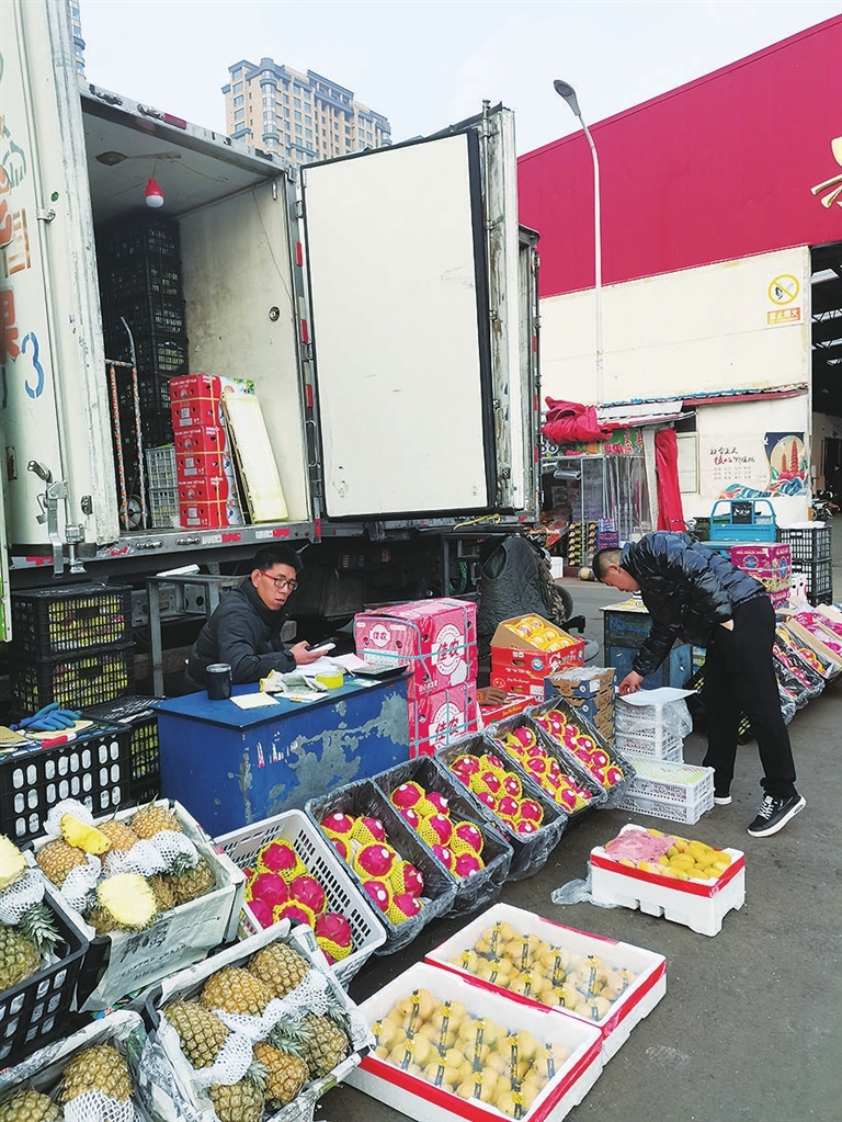 2月25日上午7时,河西农副产品批发市场内已是热火朝天,各种厢式大货车停成了排,问价的、带货的、打包的……各路客商纷至沓来,苹果、橙子、菠萝、豆角、黄瓜、西红柿、大白菜……各式水果蔬菜悉数进场,大车卸,小车拉,摊主们一边称重量,一边码新品,算账收钱一刻也不敢耽搁,来来往往皆是烟火味道。