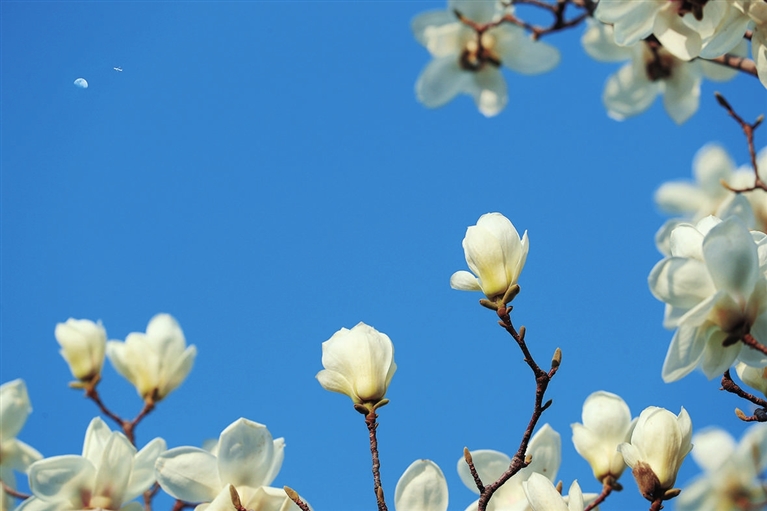 碑林公园的玉兰,繁花满树,花白如玉,气质似兰,远远望去,“日晃帘栊晴喷雪”的意境立现。走近了看,大大的白色、紫色、黄色花朵亭亭站立在干枝上,枝干仰天伸展,素雅娴静,又遗世独立。