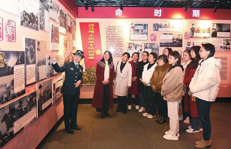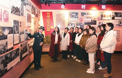 3月18日,山西水利职业技术学院的学生走进省军区太原第一干休所,开展国防教育主题活动。同学们参观荣誉室,学习了先辈们的革命历史,激发爱党爱国热情。 邓寅明 摄