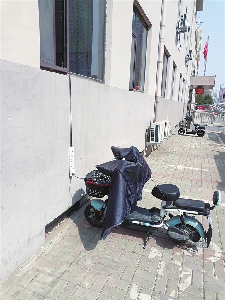 3月18日中午,记者在玉门河北沿岸新康乐巷13号院看到,好几辆电动车正在“飞线充电”,有一楼的、三楼的,甚至还有五楼的,造成消防安全隐患。 记 者 刘晓亮 摄