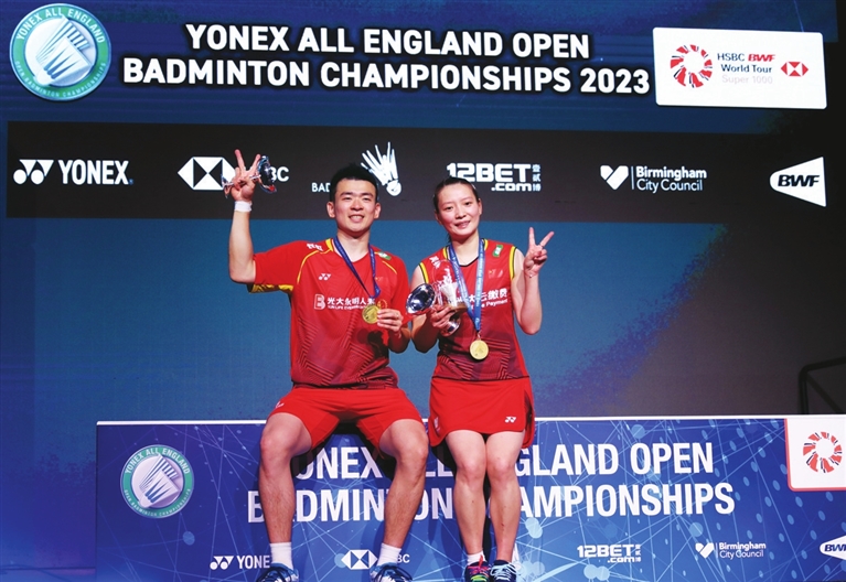 3月19日,在英国伯明翰举行的全英羽毛球公开赛混双决赛中,中国组合郑思维/黄雅琼以2比1战胜韩国组合徐承宰/蔡侑玎,夺得冠军。 新华社 发