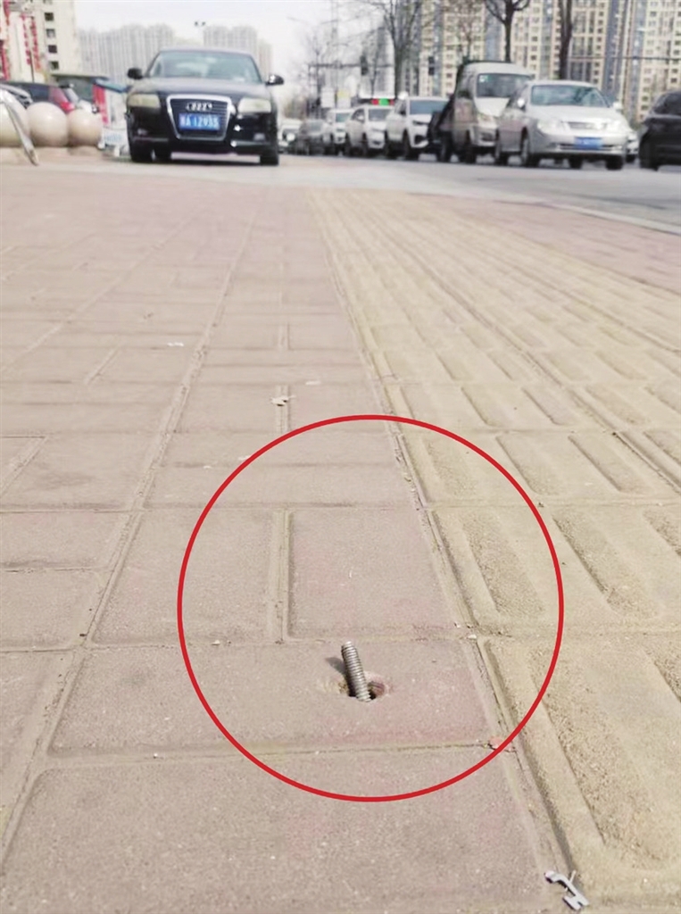 拍摄经过:这是我在千峰南路与沙沟中街交叉口附近人行便道上拍到的图片。小小“地钉”看似不起眼,实则危害很大,希望相关部门引起重视,尽快处理。郭晓华 整理