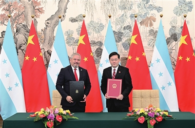 中华人民共和国和洪都拉斯共和国,根据两国人民的利益和愿望,兹决定自公报签署之日起相互承认并建立大使级外交关系。
