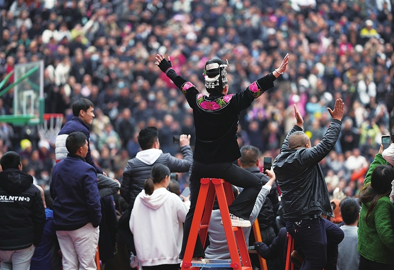 比赛间隙,极富地方与民族特色的文艺表演赋予了“村BA”又一抹亮色。3月25日晚,苗族歌手唱响《对歌对到日落坡》,带动现场上万名观众打开手机灯光参与其中,村口球场瞬间化身为氛围感满分的“体育狂欢”。