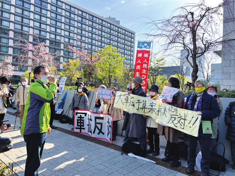 当天,从日本各地赶来的民众聚集在参议院对面举行抗议活动,他们举着“反对军备扩张”“阻止军备扩张预算”的标语牌,高喊“反对准备战争的军备扩张预算”“停止执行军备扩张预算”等口号。