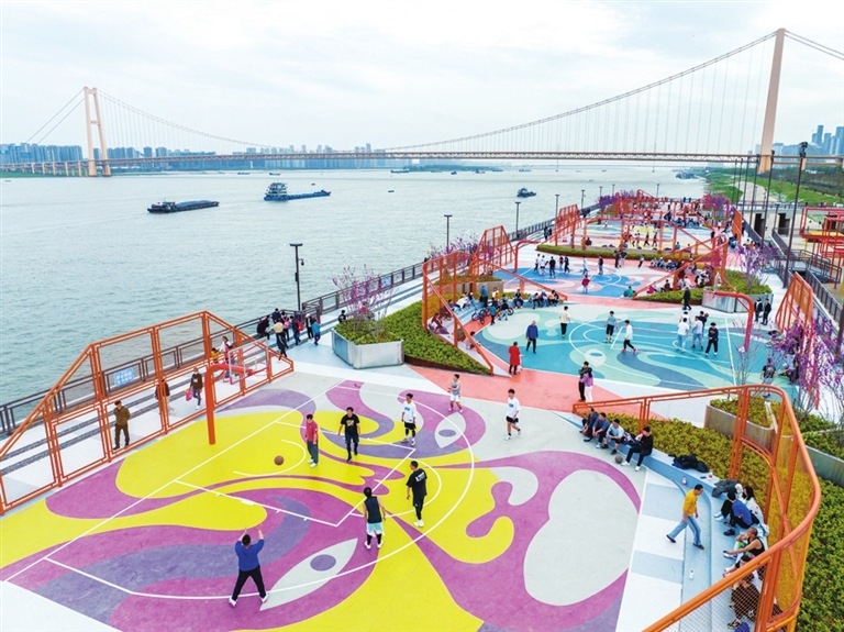 “地上脸谱彩绘给人眼前一亮的感觉。球场面朝长江,江风吹过来很清爽,很舒服。”中南民族大学大二学生吴睿周末与朋友相约打球,刚踏上场地,他就被杨泗港都市T台“国风”篮球场惊艳到了。对撞色脸谱风格的地面、片段布局半开放式的围挡以及大面积暖橙色的涂染,让这片视觉上极具冲击力的球场与周围环境相映成趣,也造就出一个武汉篮球圈新晋热门“打卡地”。