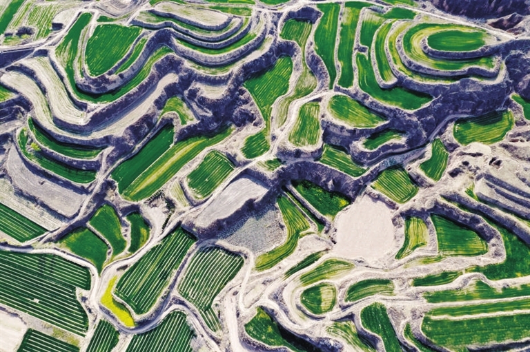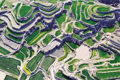 3月28日,山西运城,航拍黄土梯田春色。阳春三月,位于山西省芮城县永乐镇的黄土梯田被层层绿色的麦苗覆盖,金黄色的油菜花点缀其间,春意浓浓,美不胜收。中新社 发