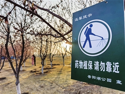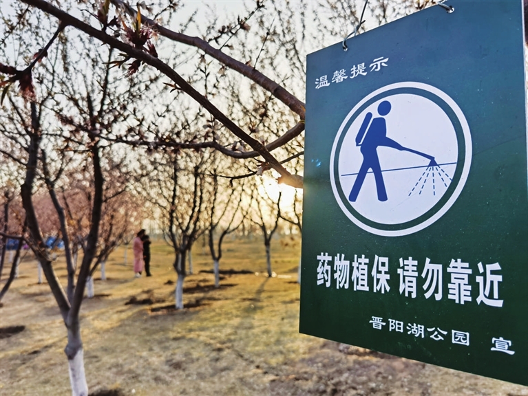 3月31日,晋阳湖公园内,尽管管理方挂出“药物植保 请勿靠近”的提示牌,但仍有游客不断倚靠花木拍照。既不安全,又不文明。 侯慧琴 摄