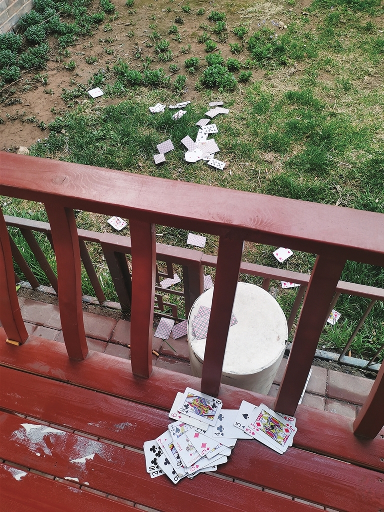 4月1日清晨7时许,在解放路开化寺街地铁站D出口附近的小游园内,大量扑克牌被随意扔在凉亭和草丛中,影响市容环境卫生。随后环卫工人捡拾了很久,才将所有垃圾清理干净。