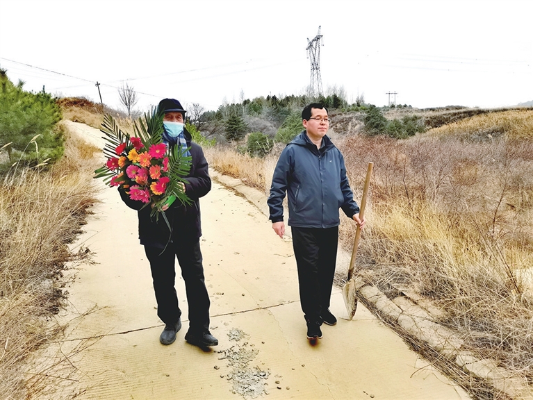 “爸,您慢点儿走。”去往烈士墓必经一段下坡路,张圪达手捧花篮,快步走在最前面,张亮通一边提醒着,一边加紧脚步追上去。“只要说来墓地,我爸的劲头就特足。”张亮通说。