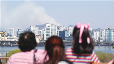 4月2日,市民在韩国首尔市眺望远处发生山火的仁王山。