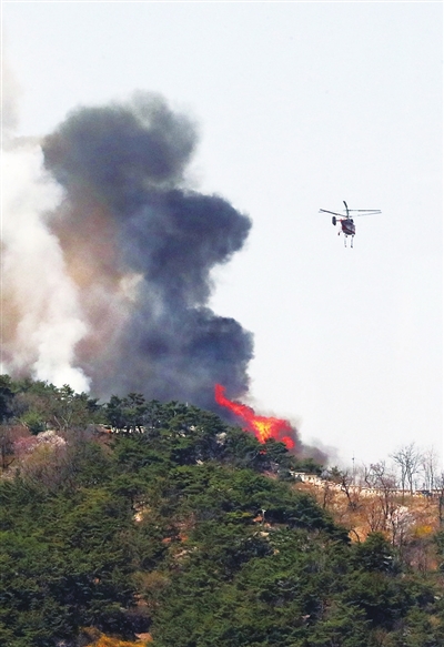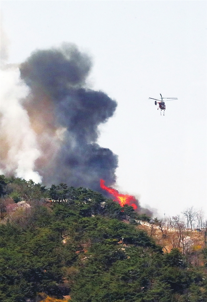 4月2日,直升机在韩国首尔市仁王山上空执行灭火作业。 新华社 发