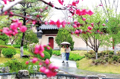 4月3日,淅淅沥沥的春雨滋润着大地,雨中游人踏青赏花,别有一番韵味。