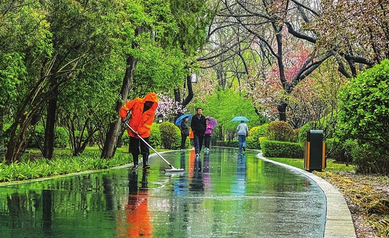 4月3日,迎泽公园环卫工人冒雨坚守岗位,清理路面积水。 王韵菲 摄