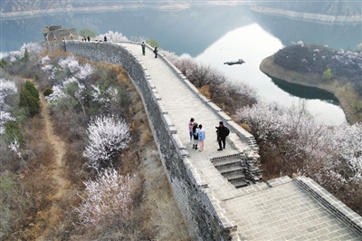 春暖花开时节,位于河北省宽城满族自治县的喜峰口水下长城两侧山花开放,绽放的花朵与古长城相映成景,吸引游人前往游览。 新华社 发